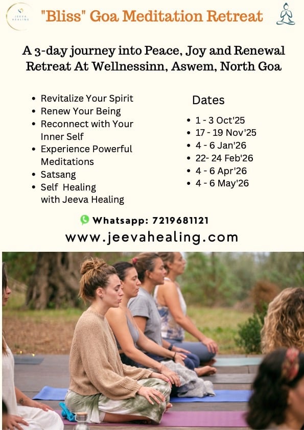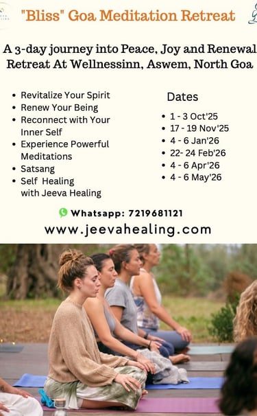 A THREE -days retreat at coastal haven of Ashwem Village, Goa. Our retreat at Wellnessinn in North Goa offers a soul-nourishing meditation practices including Jeeva Healing, and heartfelt Satsang.
